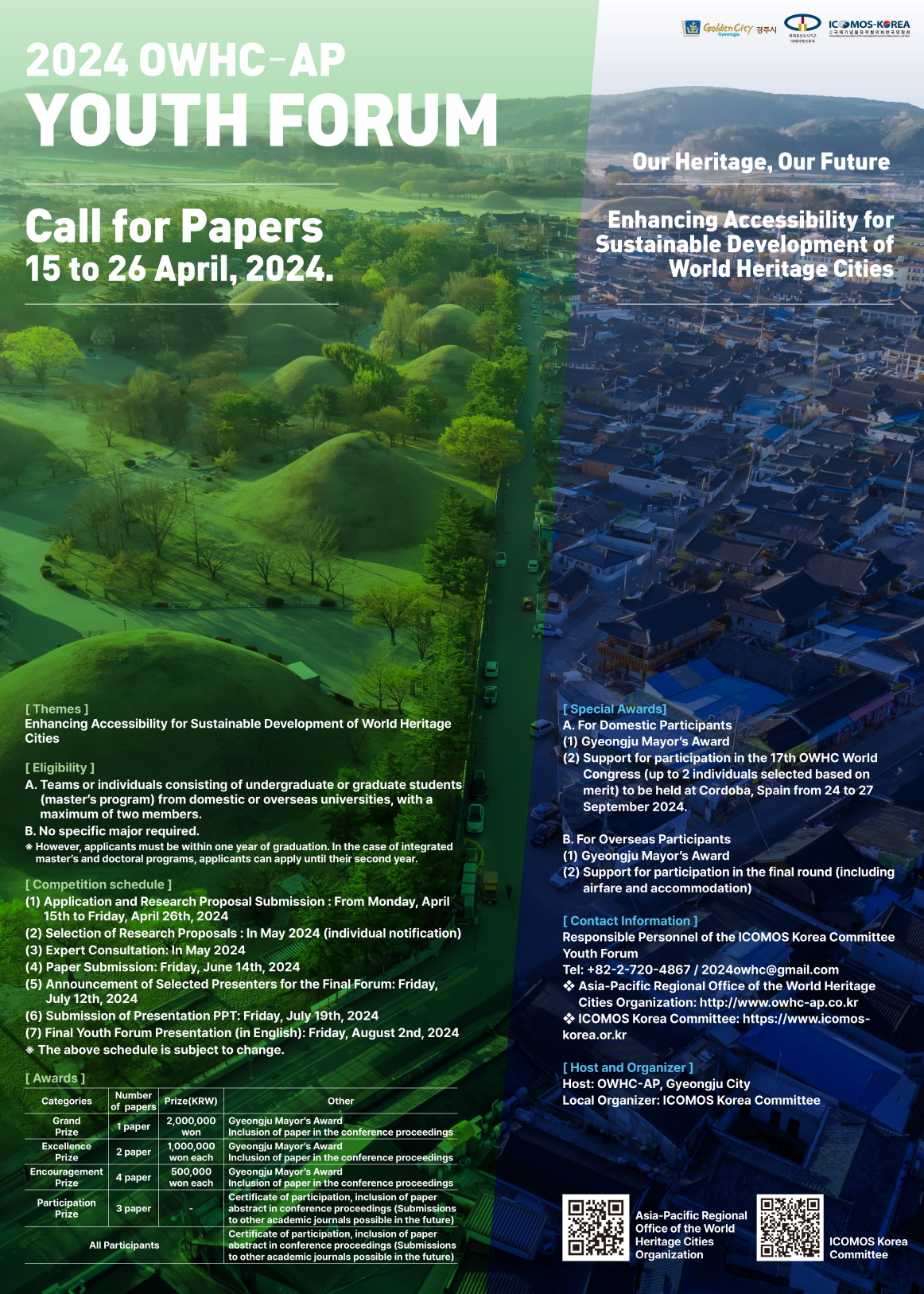 1. The theme of research paper - Our Heritage, Our Future: Enhancing Accessibility for Sustainable Development of World Heritage Cities 2. Eligibility A. Teams or individuals consisting of undergraduate or graduate students (master’s program) from domestic or overseas universities, with a maximum of two members. B. No specific major required. ※ However, applicants must be within one year of completion. In the case of integrated master's and doctoral programs, applicants can apply until their second year. ※ “Domestic” and “Overseas” classifications are based on the location of the applicant’s institution, not the nationality of the applicant. For example, if the address of the institution is in Korea, the applicant is considered domestic. 3. Competition Schedule (1) Application and Research Proposal Submission: From Monday, April 15th to Friday, April 26th, 2024 (2) Selection of Research Proposals (6 teams from domestic and 4 teams from overseas): In May 2024 (individual notification) (3) Expert Consultation: In May 2024 (4) Paper Submission: Friday, June 14th, 2024 * Note: The length of the paper should not exceed 10 pages, including tables, figures, plates, photographs, and references. (5) Announcement of Selected Presenters for the Final Forum: Friday, July 12th, 2024 (6) Submission of Presentation PPT: Friday, July 19th, 2024 (7) Final Youth Forum Presentation (in English): Friday, August 2nd, 2024 ※ The above schedule is subject to change. * Application and Research Proposal Submission - From April 15th(Mon) to 4pm on April 26th(Fri), 2024 (KST) 4. How to Apply - Please download and fill out the attached application form, and submit it via E-mail(2024owhc@gmail.com). 5. Contact Information - Responsible Personnel of the ICOMOS Kora Committee Youth Forum ▶ Tel : +82-2-720-4867 ▶ E-mail : 2024owhc@gmail.com * For more details, please refer to the attached documents. |