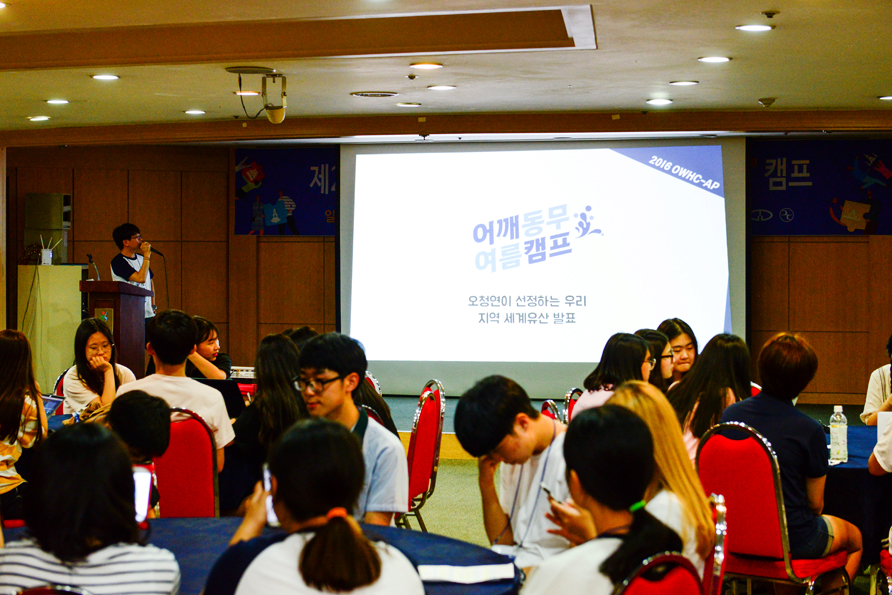 작년에 이어 두 번째로 열린 이번 어깨동무캠프는 8개 도시, 13개 학교, 150여명의 고등학생들이 참여하여 『우리가 그리는 세계유산도시』를 주제로 한 걸개그림 그리기, ‘오청연이 선정하는 우리지역 세계유산’ 제1호 선정하기 등 지역의 세계유산을 배우고 청소년들 간의 교류를 통해 OWHC 회원도시 청소년들의 참여를 독려하는 시간을 가졌습니다.