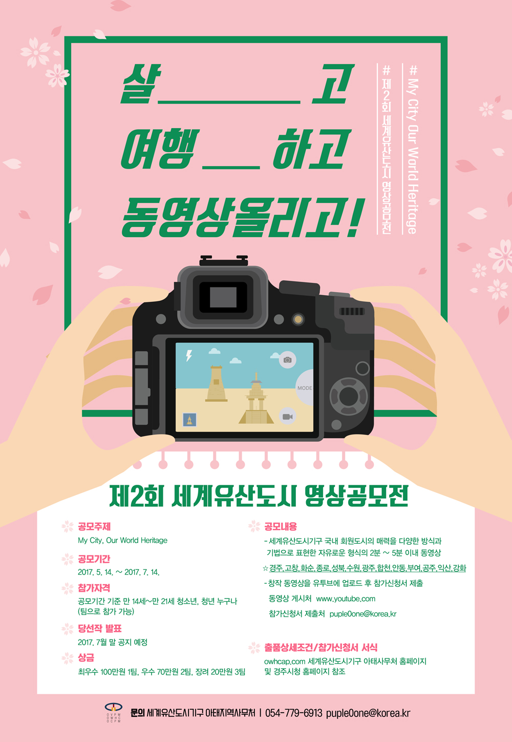 제2회 세계유산도시 영상공모전 개최 작성일 : 2017-04-24 파일첨부 : “세계유산도시를 너만의 영상으로 표현해봐!”유네스코 세계유산목록에 등재된 유산을 간직한 도시-세계유산도시에서 살고, 여행하고, 사랑하는 모든 이야기를 담아보세요.본 공모전 총상금 300만원 이외에도, 각 도시를 대표하는 영상은세계유산도시기구 본부 국제영상공모전에 출품해드립니다!내가 살고 있는, 또는 여행할 세계유산도시의 매력을전 세계에 알려주세요! 제7기 세계유산도시기구 아태지역사무처(OWHC-AP) 청년홍보위원회 모집 공고제6기 세계유산도시기구 청년홍보위원회 워크샵 개최