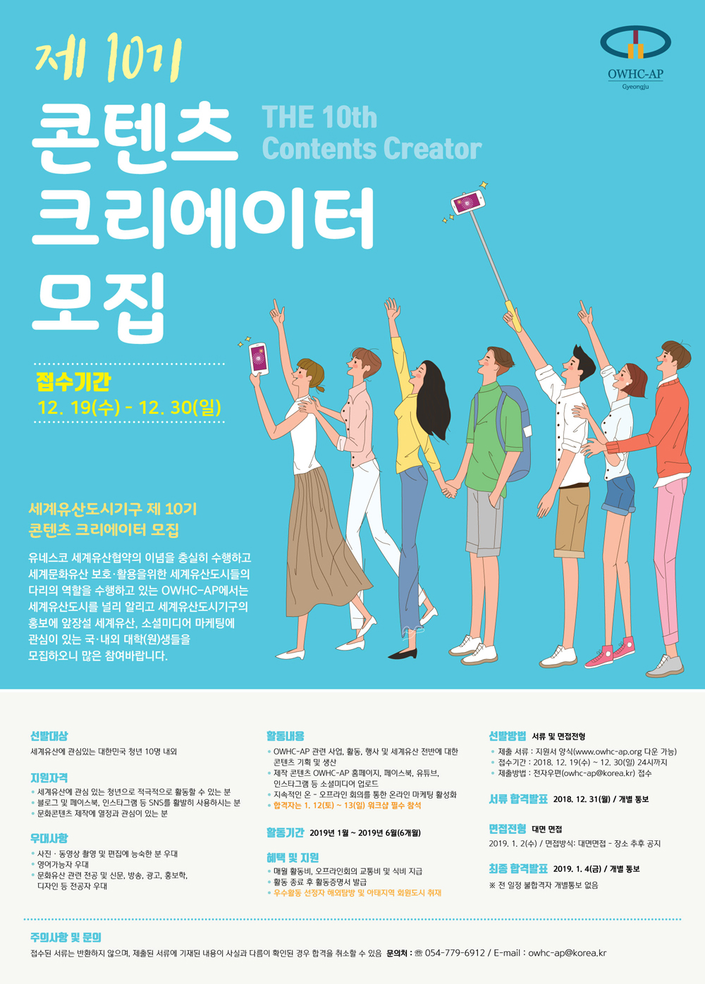□ 선발 대상 : 세계유산에 관심 있는 대한민국 청년 10명 내외 □ 지원 자격 -세계유산에 관심 있는 청년으로 적극적으로 활동할 수 있는 분 - 블로그 및 페이스북, 인스타그램 등 SNS를 활발히 사용하시는 분 - 문화콘텐츠 제작에 열정과 관심이 있는 분 □ 우대 사항 - 사진․동영상 촬영 및 편집에 능숙한 분 우대 - 영어가능자 우대 - 문화유산 관련 전공 및 신문, 방송, 광고, 홍보학, 디자인 등 전공자 우대 □ 활동 내용 - OWHC-AP 관련 사업, 활동, 행사 및 세계유산 전반에 대한 콘텐츠 기획 및 생산 - 제작 콘텐츠 OWHC-AP 홈페이지, 페이스북, 유튜브, 인스타그램 등 소셜미디어 업로드 - 지속적인 온.오프라인 회의를 통한 온라인 마케팅 활성화 - 합격자는 1. 12(토) ~ 13(일) 워크샵 필수 참석 □ 활동 기간 : 2019년 1월 ~ 2019년 6월(6개월) □ 혜택 및 지원 - 매월 활동비, 오프라인회의 교통비 및 식비 지급 - 활동 종료 후 활동증명서 발급 - 우수활동 선정자는 유명 여행작가 '안시내'와 함께 해외탐방 및 아태지역 회원도시 취재 □ 선발방법 : 서류전형 및 면접전형 - 제출 서류 : 지원서 양식(www.owhc-ap.org 다운 가능) - 접수기간 : 2018. 12. 19(수) ~ 12. 30(일) 24시까지 - 제출방법 : 전자우편(owhc-ap@korea.kr) 접수 □ 서류전형 합격자 발표 : 2018. 12. 31(월) / 개별 통보 □ 면접 전형 - 2019. 1. 2(수) / 면접방식: 대면면접 - 장소 추후 공지 □ 최종 합격자 발표 : 2019. 1. 4(금) / 개별 통보 - 전 일정 불합격자 개별통보 없음 ※주의사항 및 문의 - 접수된 서류는 반환하지 않으며, 제출된 서류에 기재된 내용이 사실과 다름이 확인된 경우 합격을 취소할 수 있음 - 세계유산도시기구 아시아 태평양지역 사무처 ☏ 054-779-6912 / E-mail : owhc-ap@korea.kr |