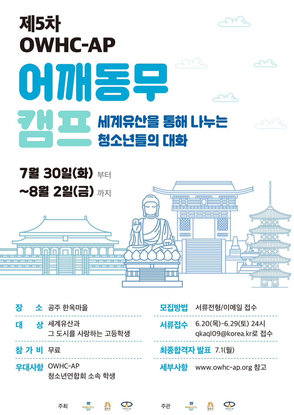 세계유산도시기구 아시아·태평양 지역사무처 (OWHC-AP)에서는 세계유산도시의 청소년들을 대상으로 『제5차 OWHC-AP 어깨동무캠프』를 개최할 예정입니다. 이에 교직이수자를 모집하여 청소년들의 세계유산교육 및 역량함양을 돕는 지도교사로 삼고자 하니 청소년들과 직접 접하며 교육 경험을 쌓을 수 있는 좋은 기회인만큼 많은 관심과 지원 부탁드립니다.